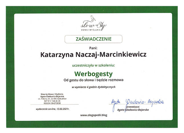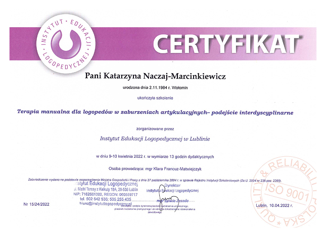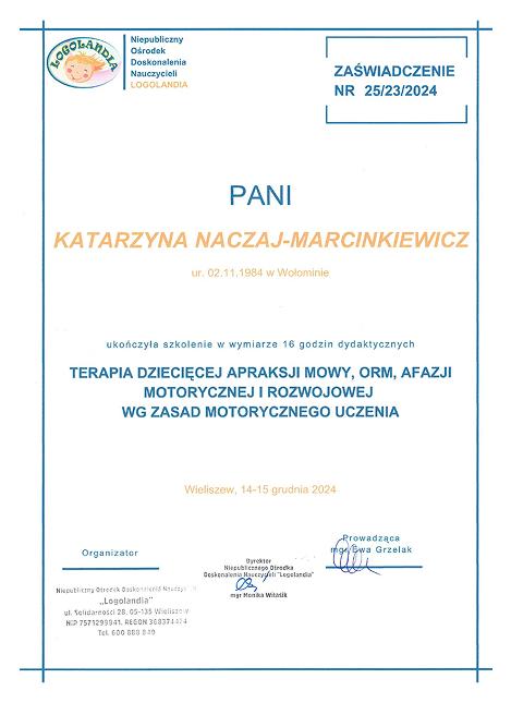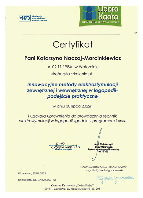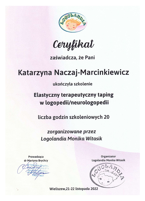 Nazywam się Katarzyna Naczaj-Marcinkiewicz i moją misją jest wspieranie dzieci, młodzieży, a także dorosłych w nauce prawidłowej wymowy, usprawnianiu oddychania i połykania, a także kształtowaniu właściwej pozycji języka. Jestem również szczęśliwą mamą trójki dzieci,